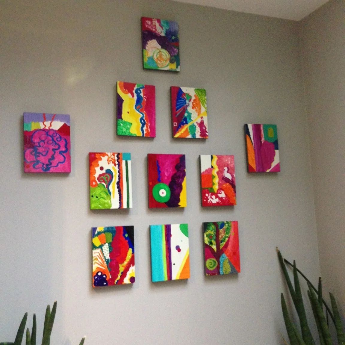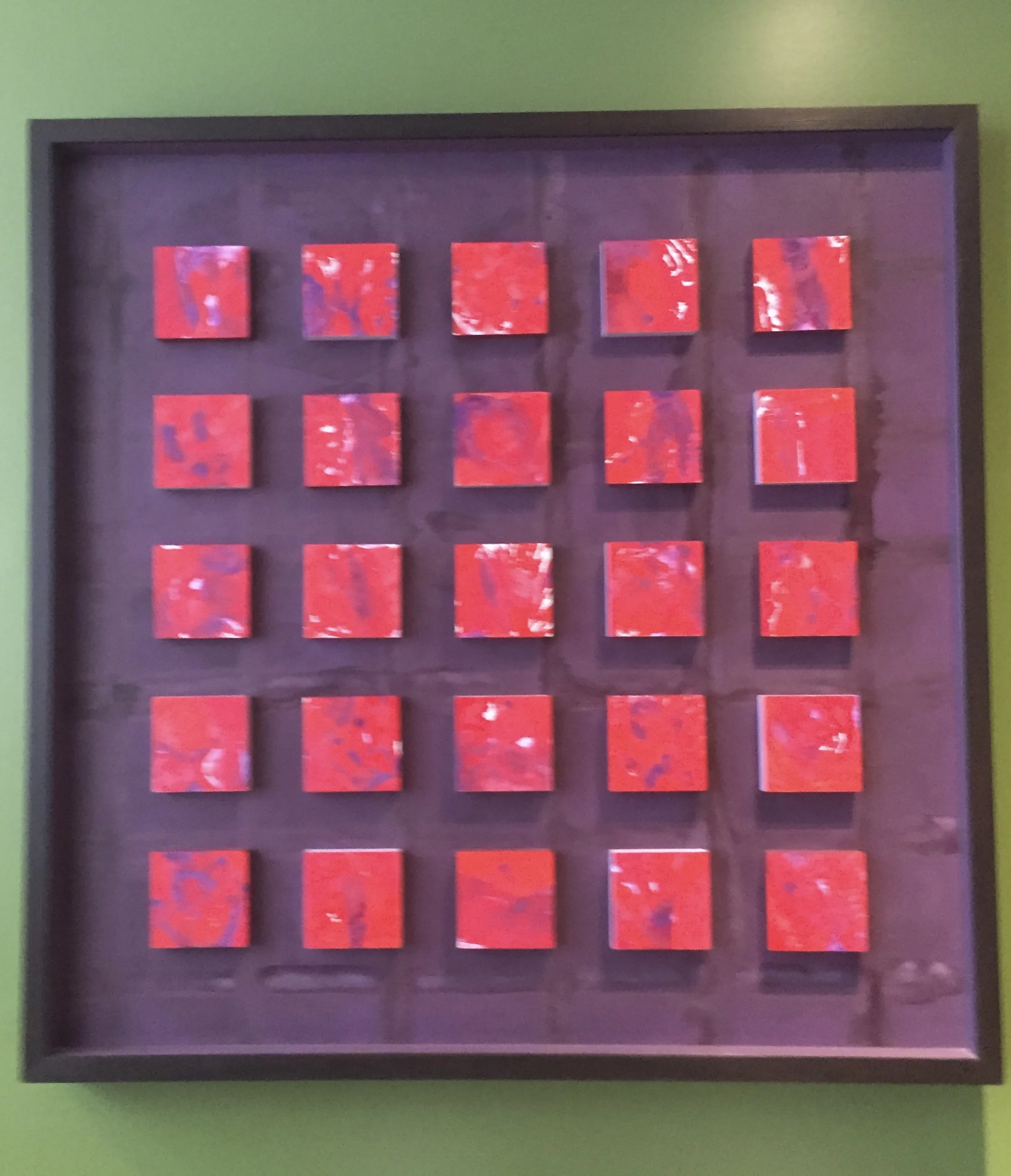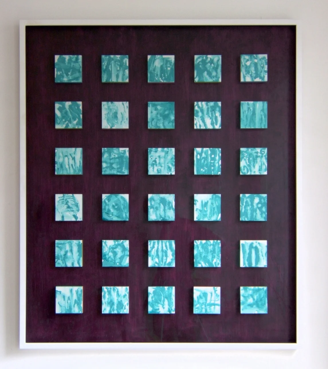 These pieces, comprising 4 x 4 x 3/4 inch wooden tablets placed in grid formation, are concerned with exploring and manipulating the spacial and rhythmical qualities of colour and light within a rigorous structure. Music has always inspired me and these pieces are my expression of its fluidity and its underlying structures and constraints.