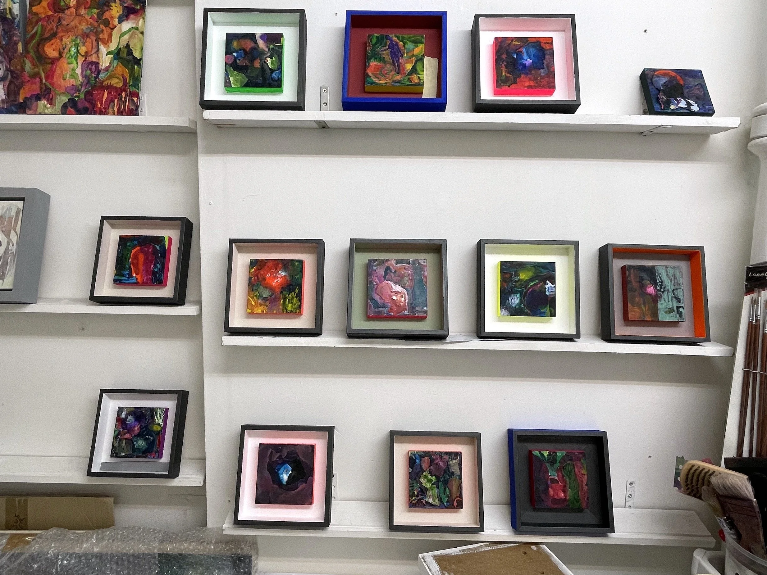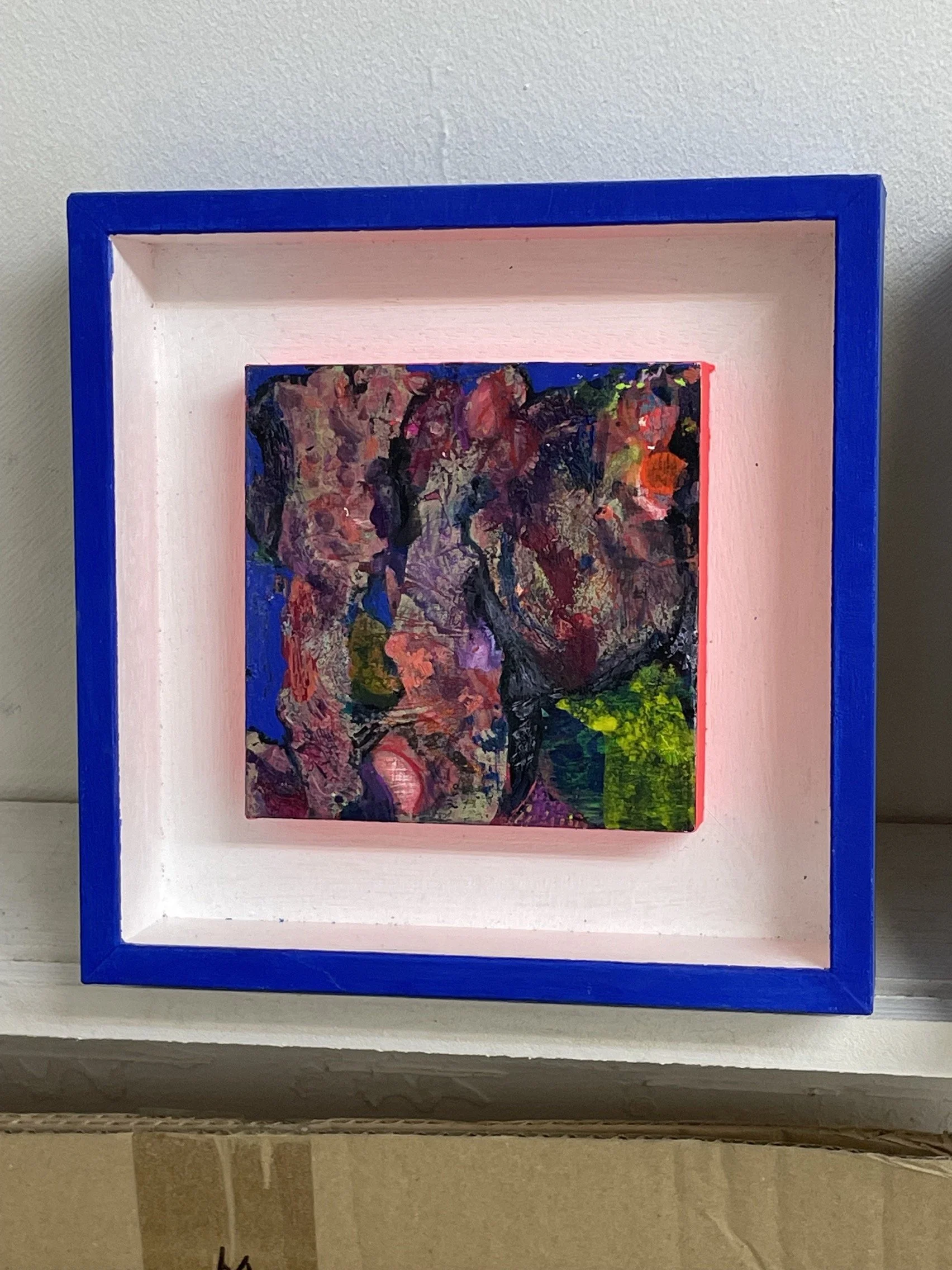 The Miniatures all come from Flow and intuition like the rest of my paintings. The frame adds a playful interaction with the painting contained.